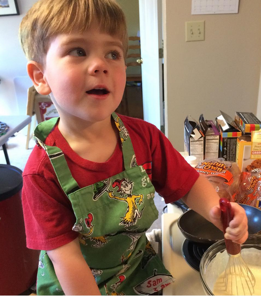 One of our favorite things to make together is pancakes. He does everything once and then “lets” me take over. We talk about how much Bisquick mix we need. He gets to stir, pour it out on the pan and flip the pancakes when done. If we’re in the mood, he sprinkles chocolate chips on some of them. I even let him flip the bacon the first time (before it starts to really sizzle and pop).